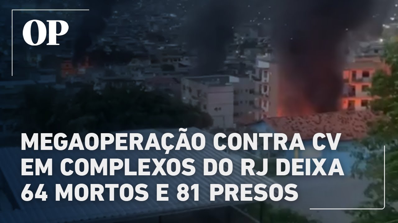A megaoperação contra o Comando Vermelho (CV) realizada nesta terça-feira, 28, nos complexos da Penha e Alemão, no Rio de Janeiro, registra até a publicação dessa matéria 64 mortos e 81 presos. Pelo menos 2.500 agentes das forças policiais do estado foram enviados à Zona Norte com 100 mandados de prisão para cumprir. Leia mais em: https://www.opovo.com.br/