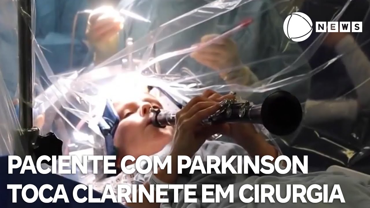 Uma paciente com Parkinson conseguiu tocar clarinete durante uma cirurgia no cérebro, lá no Reino Unido. O procedimento é conhecido como estimulação cerebral profunda e fez a paciente recuperar os movimentos. Denise Bacon, de 65 anos, foi diagnosticada com a doença em 2014.
